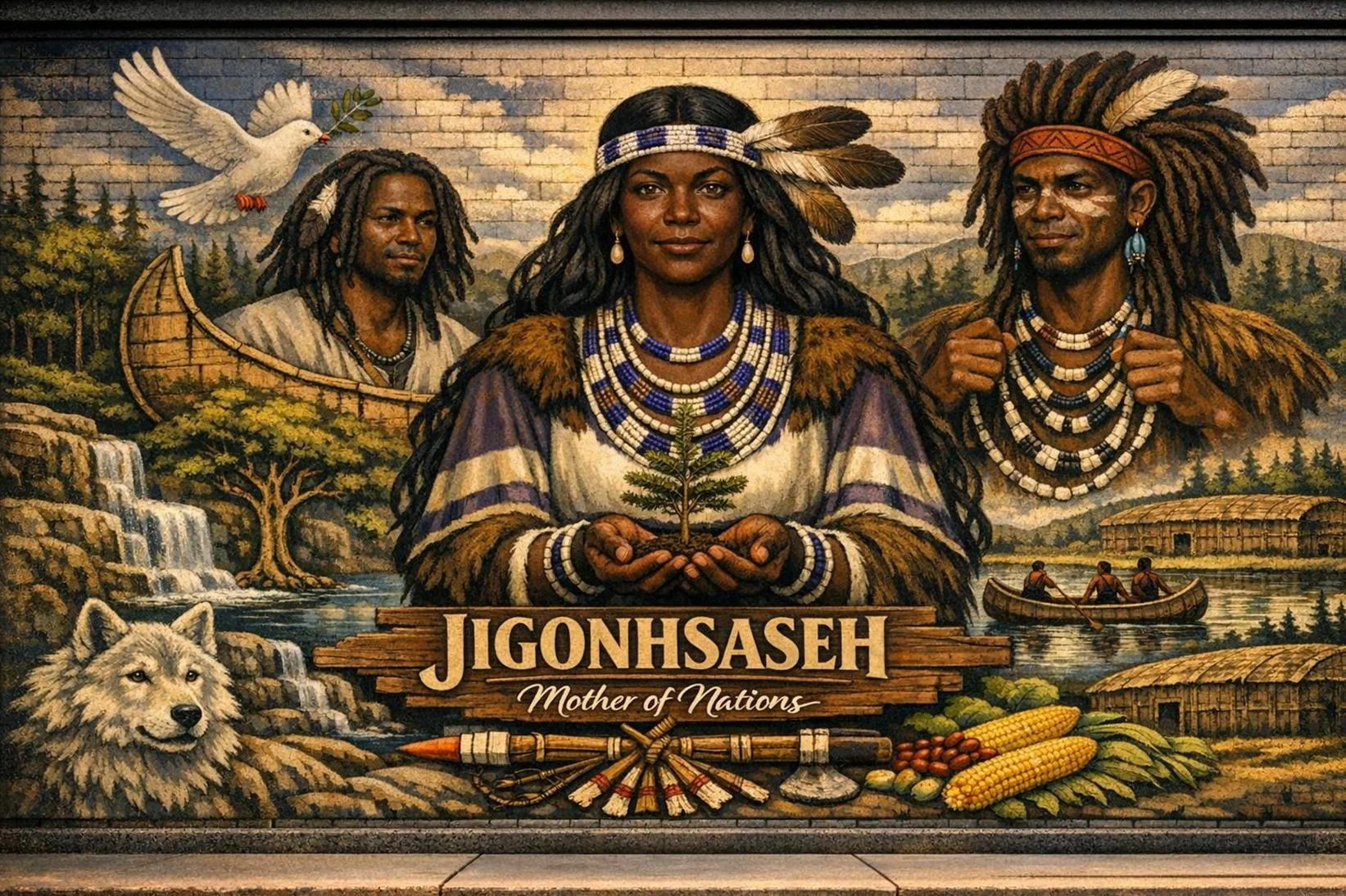 When the Five Nations of the Iroquois established their League of Nations, back in the stone age of this aboriginal Empire State, they laid down in their wampum codes certain fundamental laws that must ever govern the condtion of peace between nations. Ages of struggle and conflict had left their impress on the mind of our race. Out of this experience we devised not only a League of Nations, but also a League to Enforce Peace. We put Atotarhoh, once of the greatest of warriors, at the head of the League of Nations, and over the League to enforce Peace. We placed a woman, Jigonsaseh, whom we called “the Mother of Nations.”